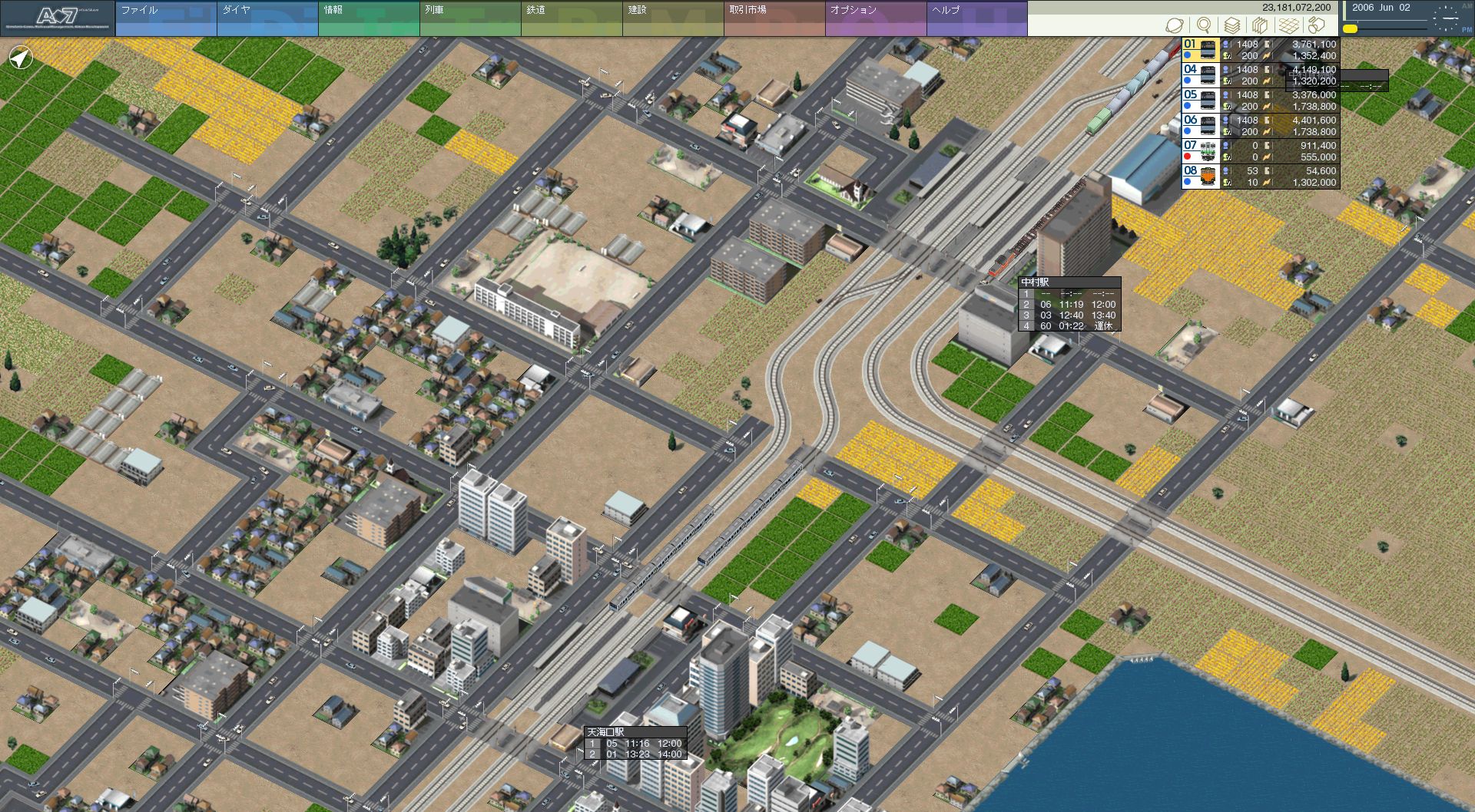 そしてその上に東西に走る路線。今はまだ北貨物線の残骸ですが、これが本線として 西方面へ伸びていきます。ただ、どのように伸ばすかは未定。長距離列車の運転という 大きな目標に向かうなら、なるべく西へ伸ばしてからぐっと曲げて南へ、というのが 一番距離が稼げますが、そうではなく、なんとなく海岸線沿いからだらだら南東に 伸ばして行きそうな気がします。