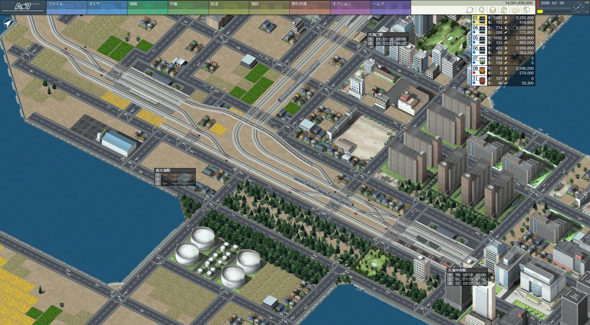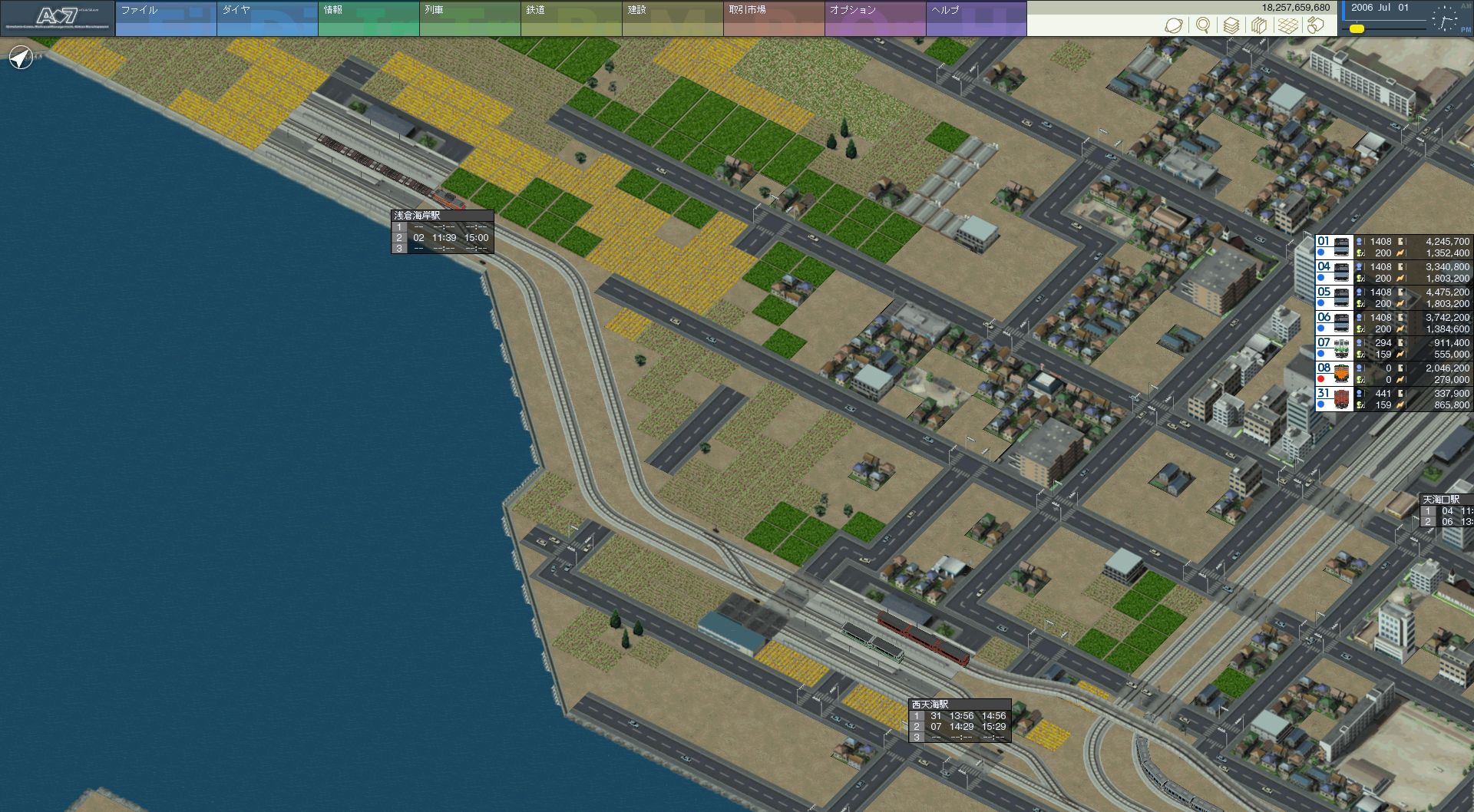 さすがにこのままだとダイヤ組むのがめんどいなぁ、と思ったので プレイ開始時点から存在していた資材工場を撤去。 駅の南側に新たに工場を建設し、3番線を下り線として浅倉海岸方面へ スルーできる配置にしました。本当に、無駄な出費だった・・・。