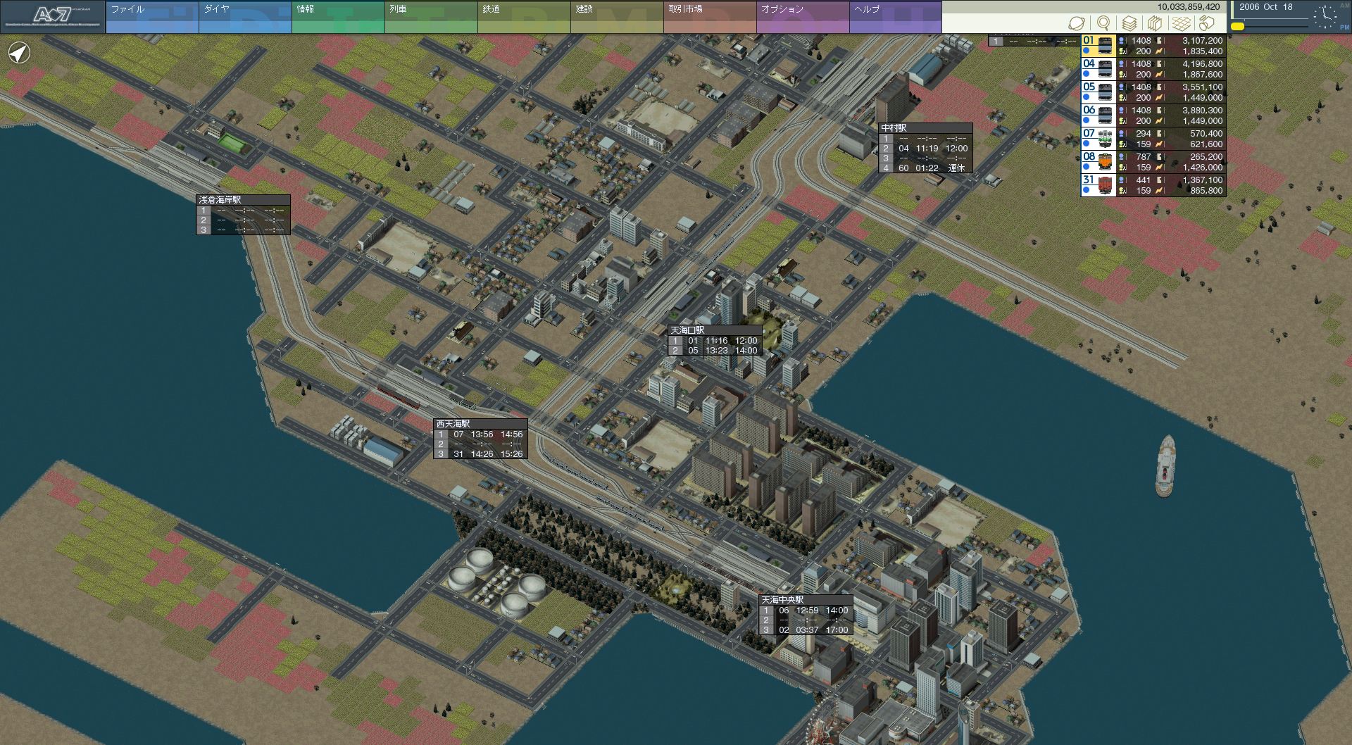 そして天海地区。プレイ開始当初と比較すると、特に天海口−天海中央あたりが 発展しているのがわかります。西天海は工業地帯、浅倉海岸はレジャー施設を 多めに設置していこうかというところ。