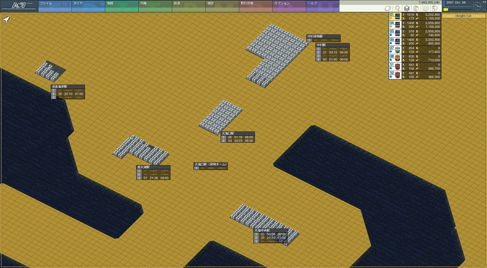 また、今まで実は貨物列車の設定のなかった天海口に資材を運び込むため、 中村貨物駅−中村駅の貨物列車を延長し、かつての北貨物線を利用して スイッチバックで天海口駅貨物ホームまで送り込みます。 かなりアクロバティックな動き・・・確実に、改善の余地ありですね(涙)