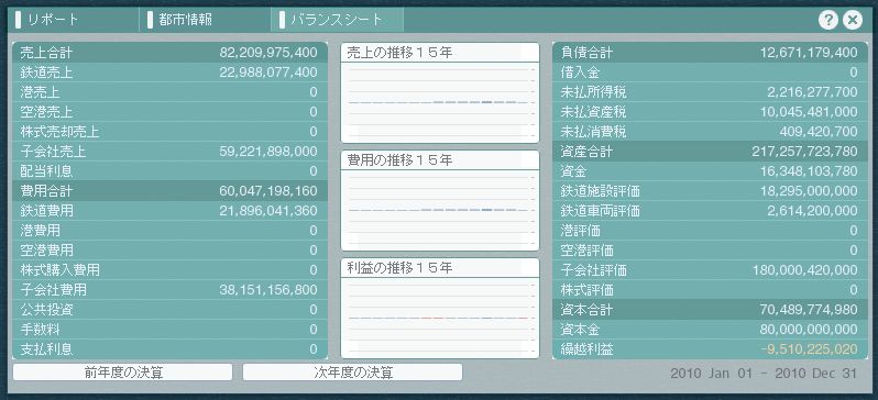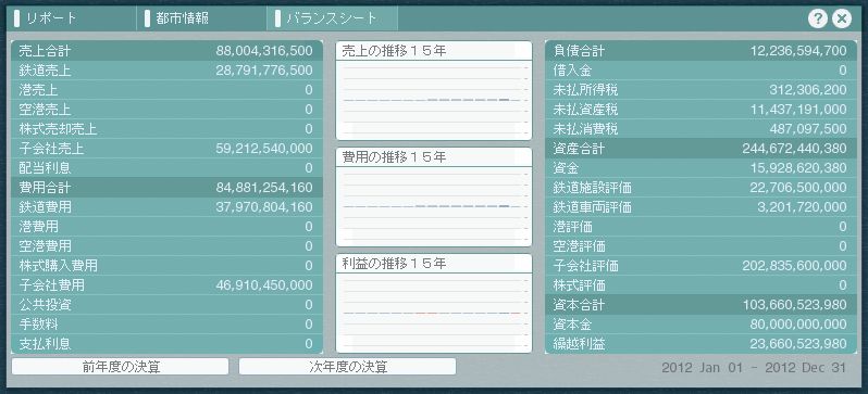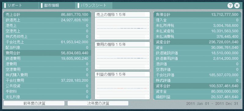 2011年には売上−費用が一気に300億突破!この10%が所得税とされるようですね。 ちなみに資産税は(資産合計−資金)×5%。わかったところでバランスシートを見て すぐに計算できるようなものでもありませんが・・・