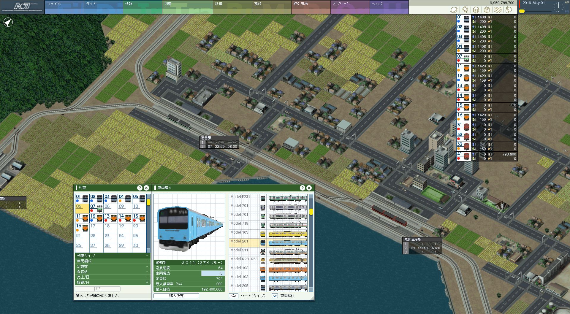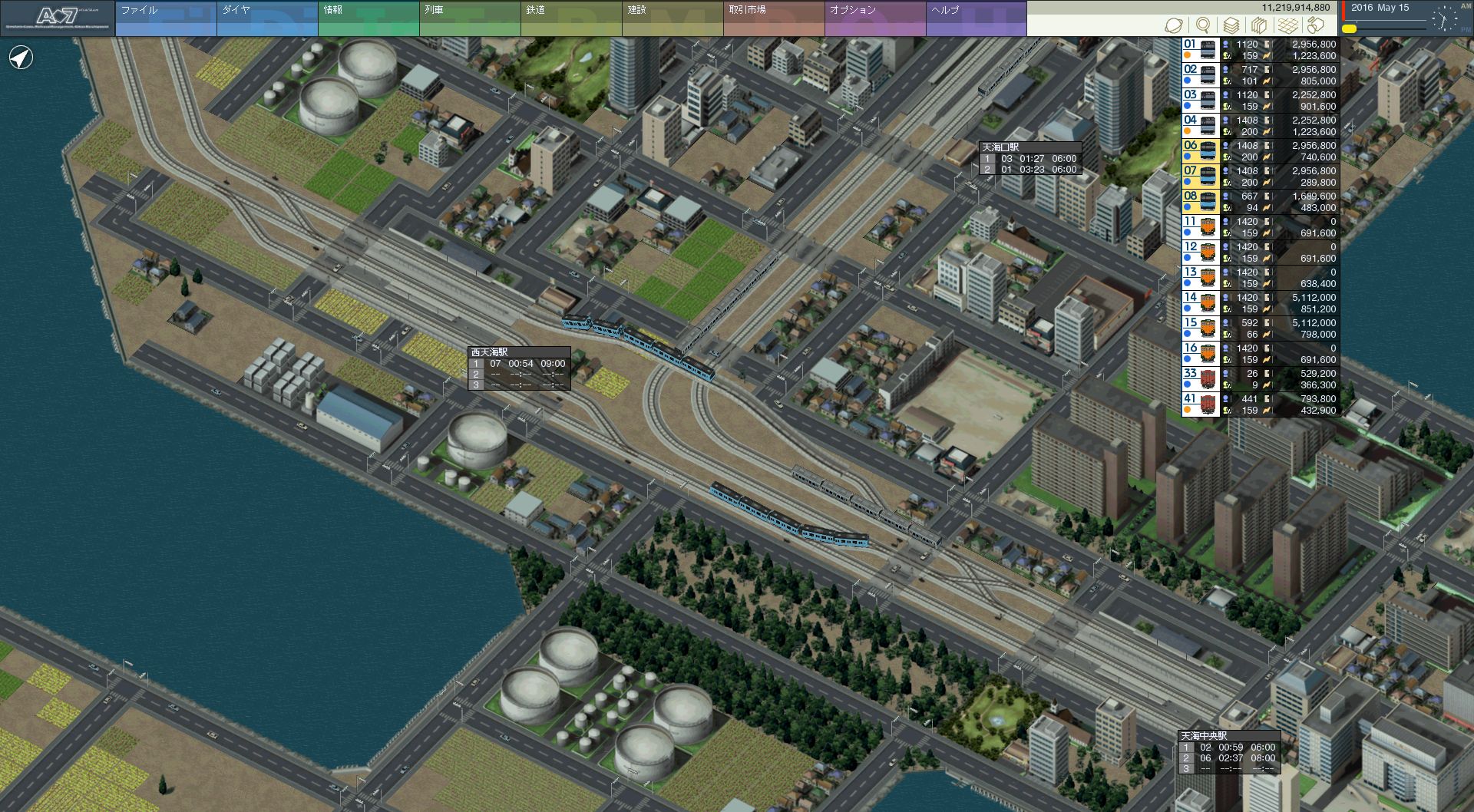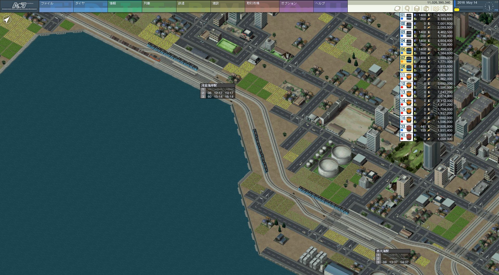 調整を重ねて、これまで天海中央−浅倉海岸の折り返し2編成と天海中央−浅倉 の通し1編成だったのを、天海中央−浅倉全線で3編成に改正。 ホームの数から言えば6編成投入も可能ですが、そこまでやると貨物を走らせる スキがなくなってしまうので、そこは控えめに。