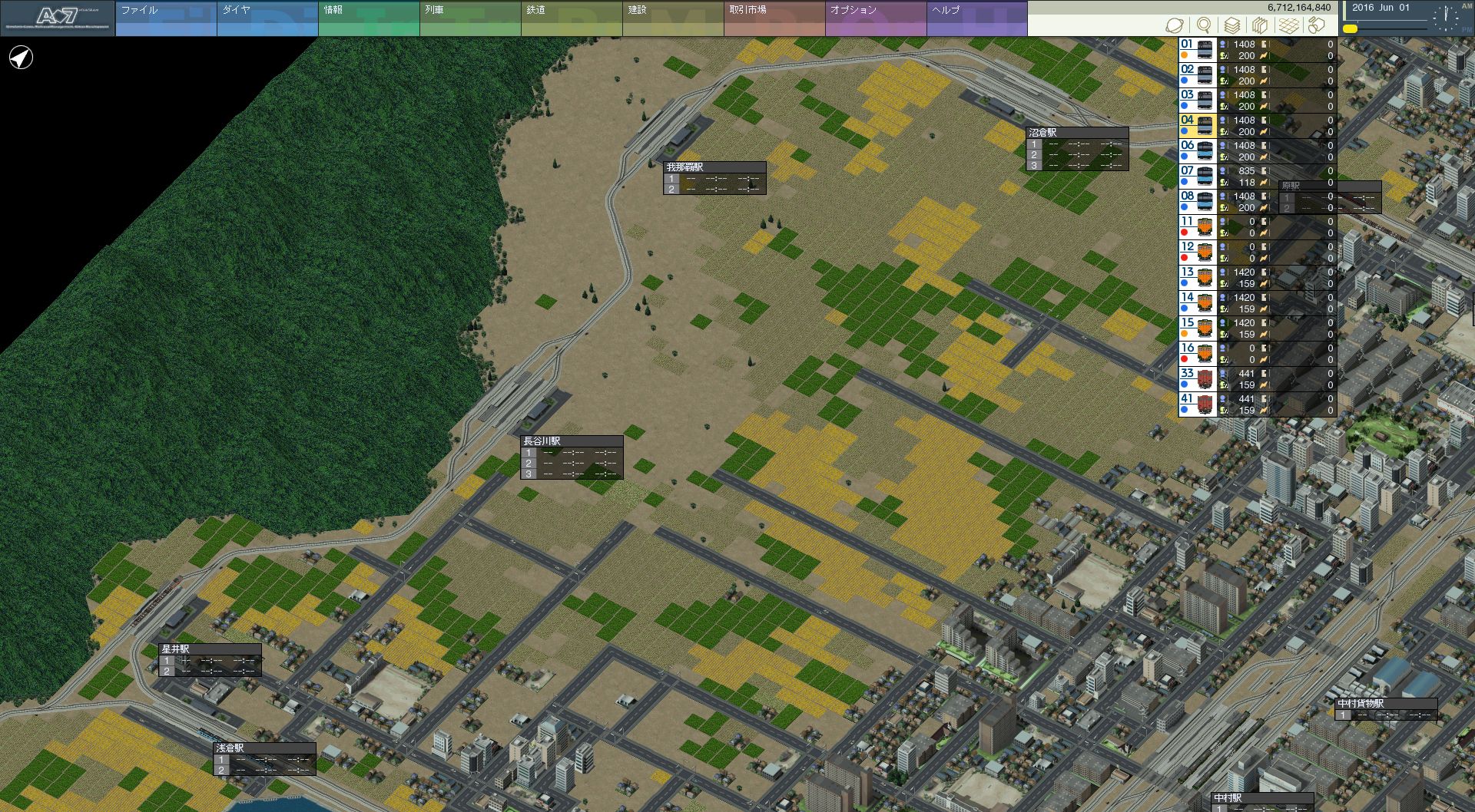 資材は黒井貨物駅から運び込むのみとなるため、我那覇まで資材が届くのには 時間がかかりそうですが、今回は資材置場をほとんど設置せず、資材控えめで 発展を遅らせて田舎の景色を保つ作戦ですので、とりあえずは困らないかなと。
