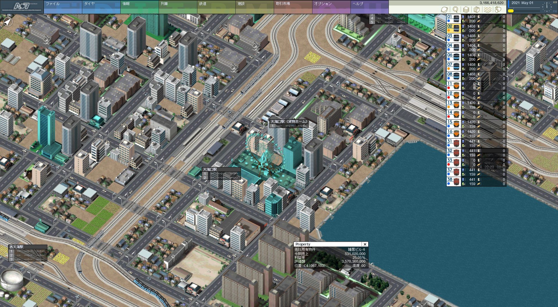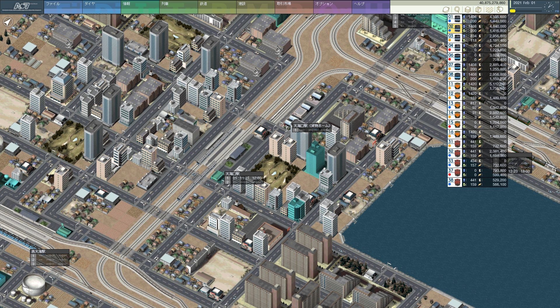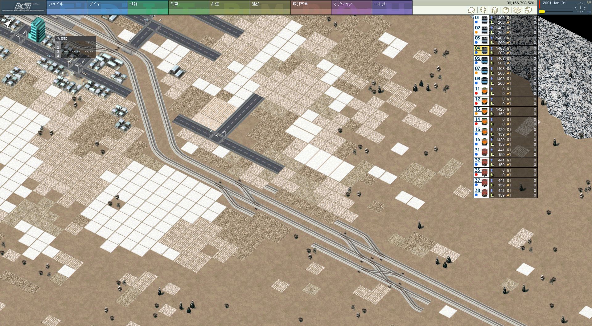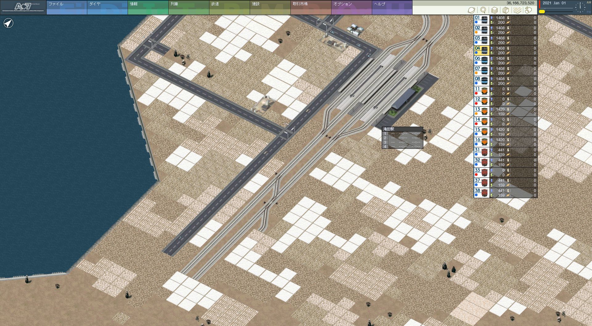 ついでに滝田から先も形だけ伸ばしてみたり。ここは一向に発展しませんね・・・ 本線の走らせる本数を増やしていないからだろうか? といっても、阪南線は花澤延伸の際に手持ちを1編成投入して増やしてるんですが、 こちらもあまり発展の気配を見せないし。 もっと頻発して、乗降客を増やしたほうがいいんだろうか?