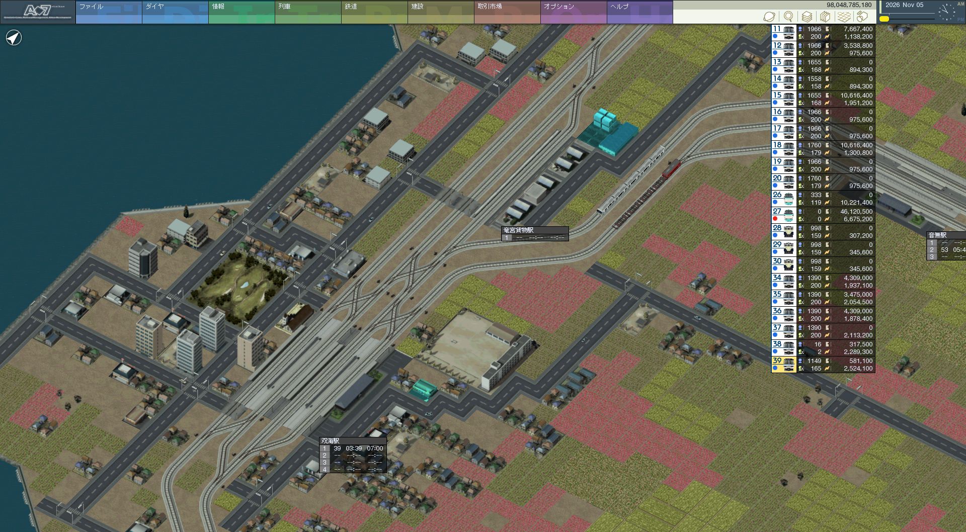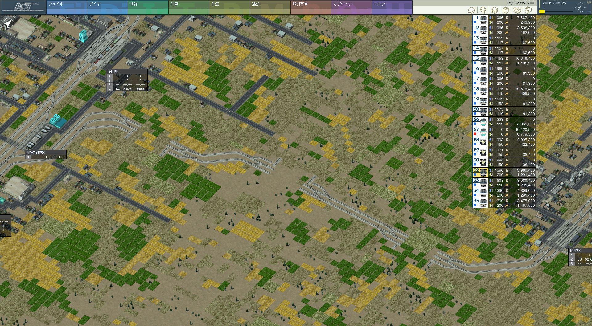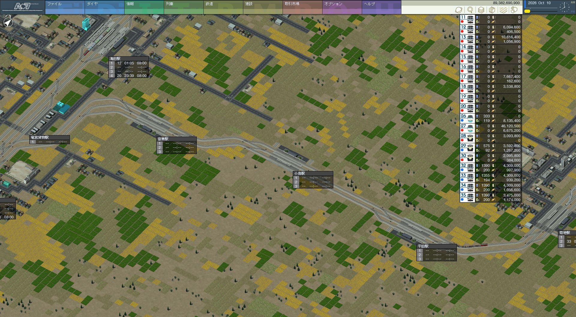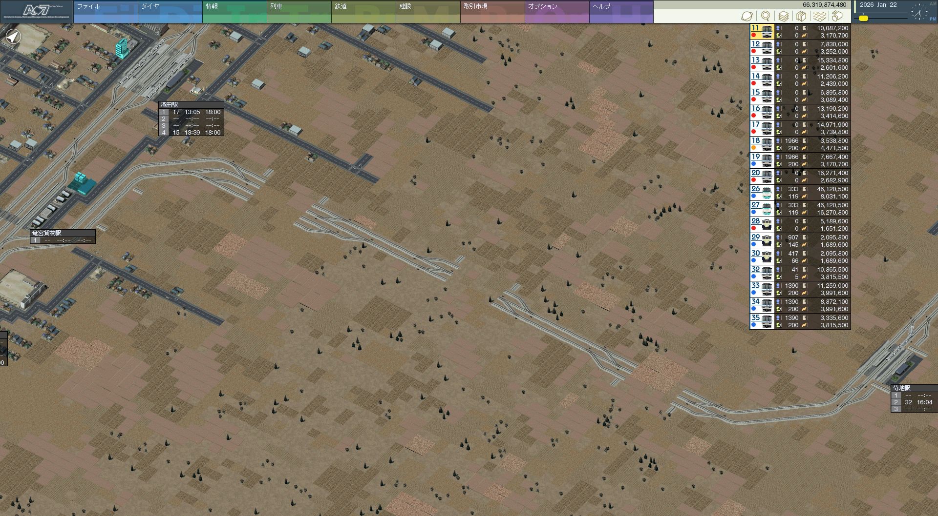 そして駅も一気に開業。菊地側から順番に、平田駅、小鳥駅、音無駅となります。 まずは貨物列車のスジを確保。残念ながら今の速度では双海で17時間停車に なりそう。他の駅を全部1時間停車にしてこの状態なので、これはどこかで 余裕時分として使うためのストックとしておきます。