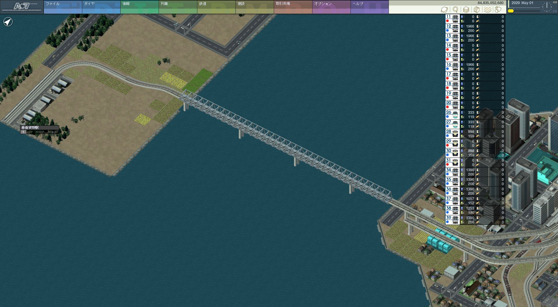 将来的には複線にしますが、今はまだ単線分だけ・・・お金が飛ぶのです(涙) 渡った先に春香貨物駅を設置。実は仮駅です・・・名前も仮です。 まぁ貨物駅ですので、地下にしこたま資材を溜め込んでいきます。 それにしても、この駅は今後確実に撤去だよなぁ・・・ちょっと もったいない。