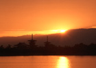 薬師寺の塔の後から陽が昇る。古代のロマンをかき立てる。